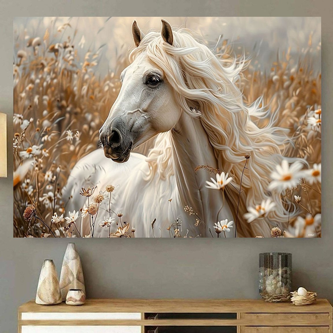 1 Framed Wooden Canvas Painting And 1 Unframed Painting Featuring An Elegant White Horse, Suitable For Home And Office Decoration, Ideal As A Creative Equestrian-themed Oil Painting For The Bedroom,