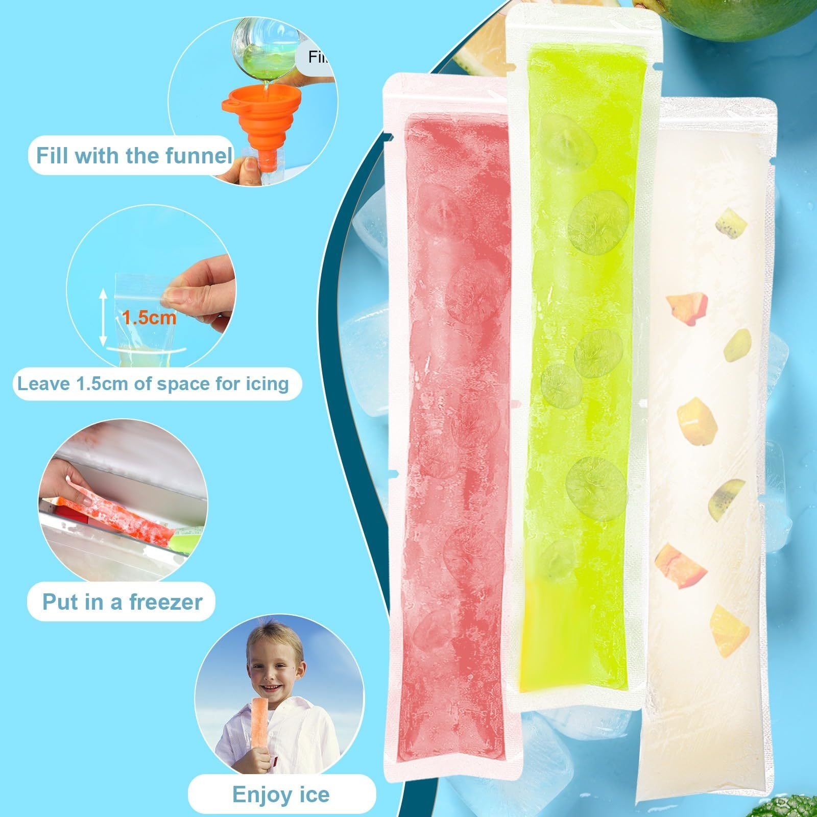 Freezer pop bags come with zipper seal, which provide you with convenient sealing method, and good sealing will keep your refrigerator clean and tidy. You just need to tear ice pop bags from the opening to eat, and you don’t need to open the sealed zipper