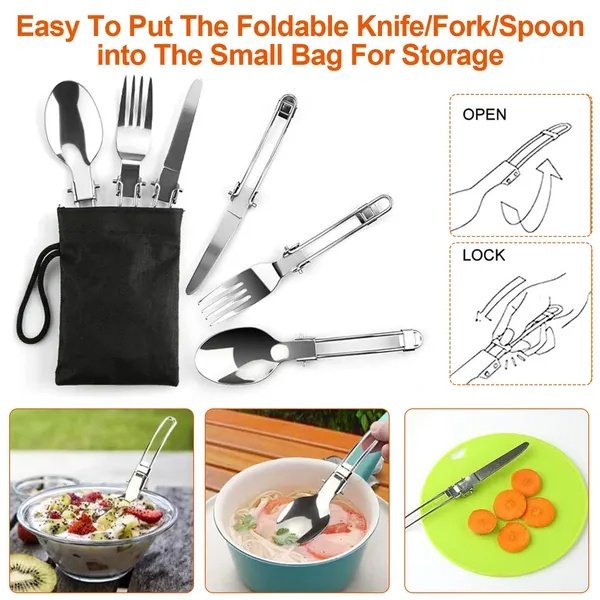 *Portable Design*:The knife/fork/spoon can be stored in a small mesh bag,space-saving and accessible,and all the cookwares can be stored in the big storage bag. Just hang it on the backpack with the attached carabiner and take it anywhere you go.