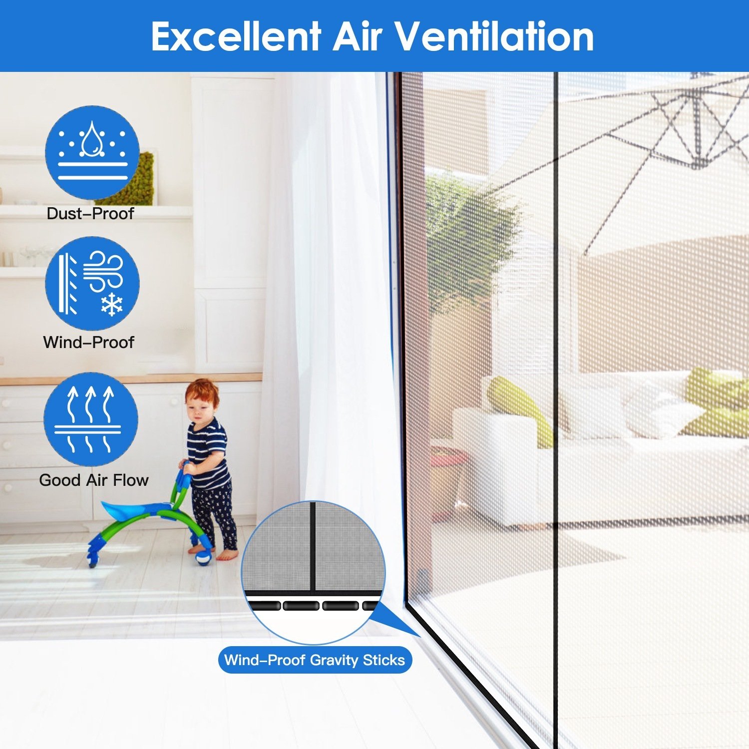 - *Considerate Design*: Equipped with 36Pcs strong magnets in the middle seam of the screen door which ensures that the screen will close automatically quickly every time and maintained best sealing. Bottom gravity sticks ensure windproof performance but allows kids/animals walk through easily. Top buckle straps allow you to roll up the door screen for car entry and exit.