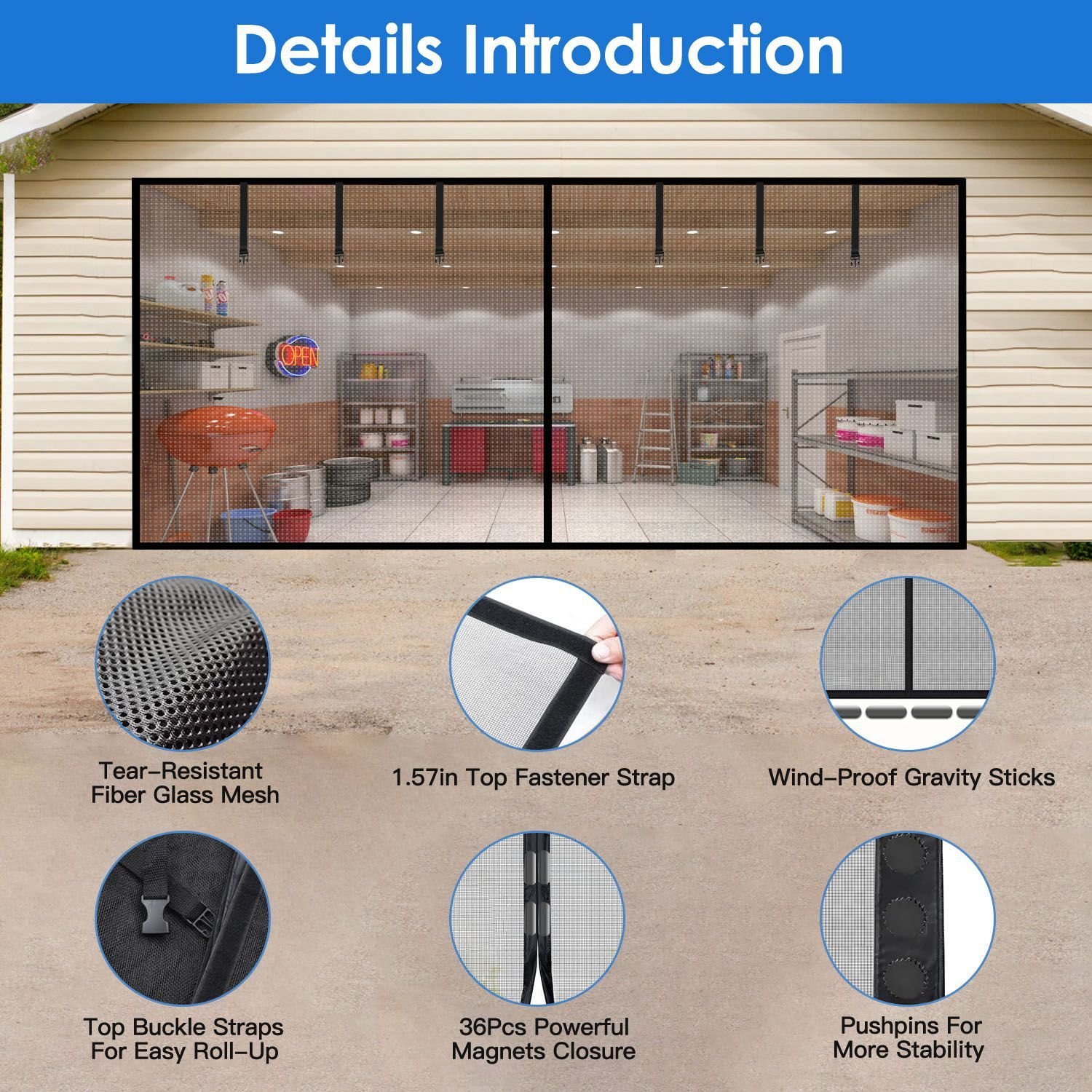 - *Advanced Fiber Glass Mesh*: Made from fiber glass mesh,the garage curtain is tear-resistant,sturdy,not easy to break,and has a strong durability and excellent air ventilation,which will efficiently keep fresh air in and critters out.