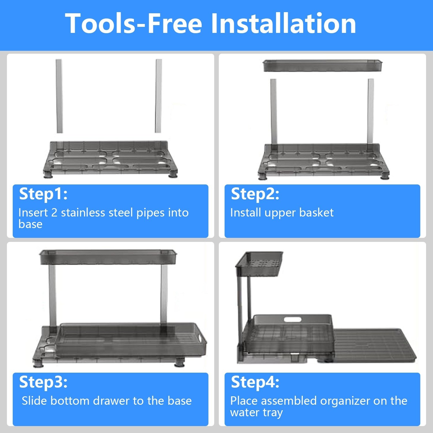 - *Easy Installation*: No tools required,just use stainless steel pipes to connect the upper basket with base and insert the drawer tray,instant assembly within minutes. Also offering multiple anti-slip tapes to add more stability and security.