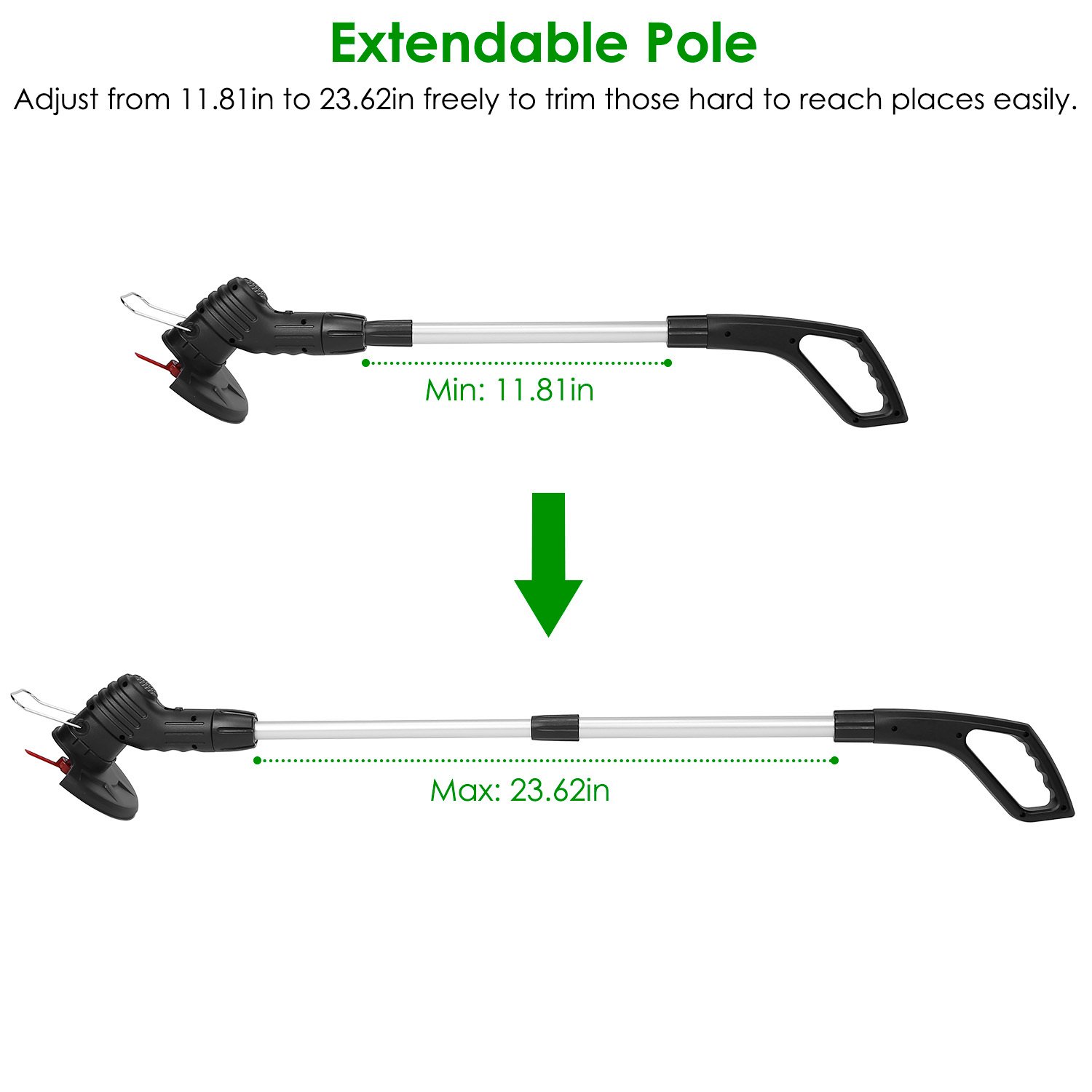 - * Extendable Pole *: The pole can be adjusted from 11.81in to 23.62in freely,easily fit your different needs and trim those hard to reach corners. Big screw knob for easily securing stable length.