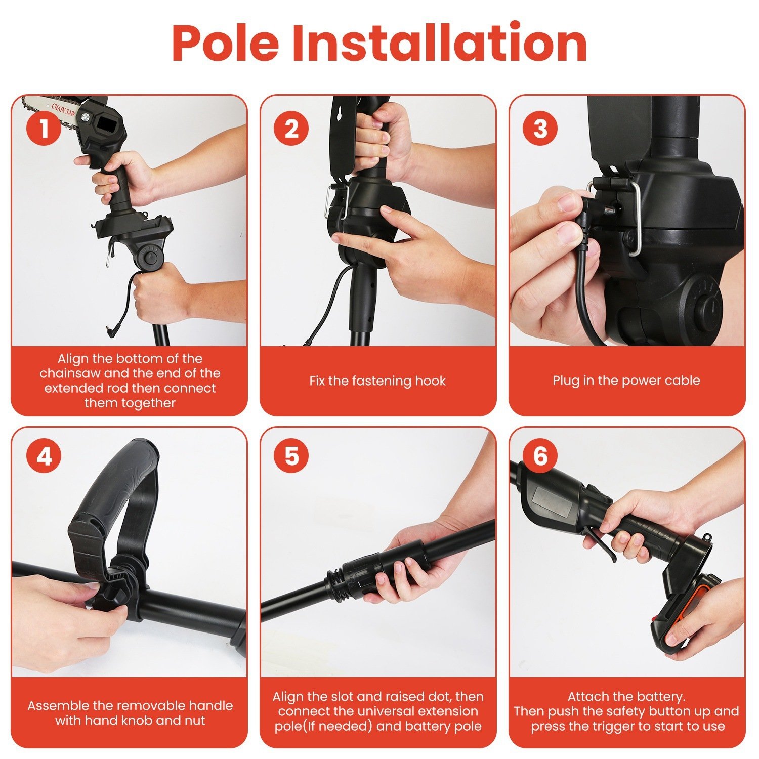 - Length Adjustable :Comes with 3 extension poles,you can assemble the chainsaw to 3 length as needed and use 4in/6in chain to meet your demands. You can use it as a handheld mini chainsaw with length of 13in,or you can extend it to 56.3in or 75.2in to cut the high tree branches that you can not reach easily. Besides,the grass trimmer can be assembled to 2 different length(56.3in/75.2in) to meet your needs. The head of both chainsaw and grass trimmer can be adjusted 90° freely according to your needs.