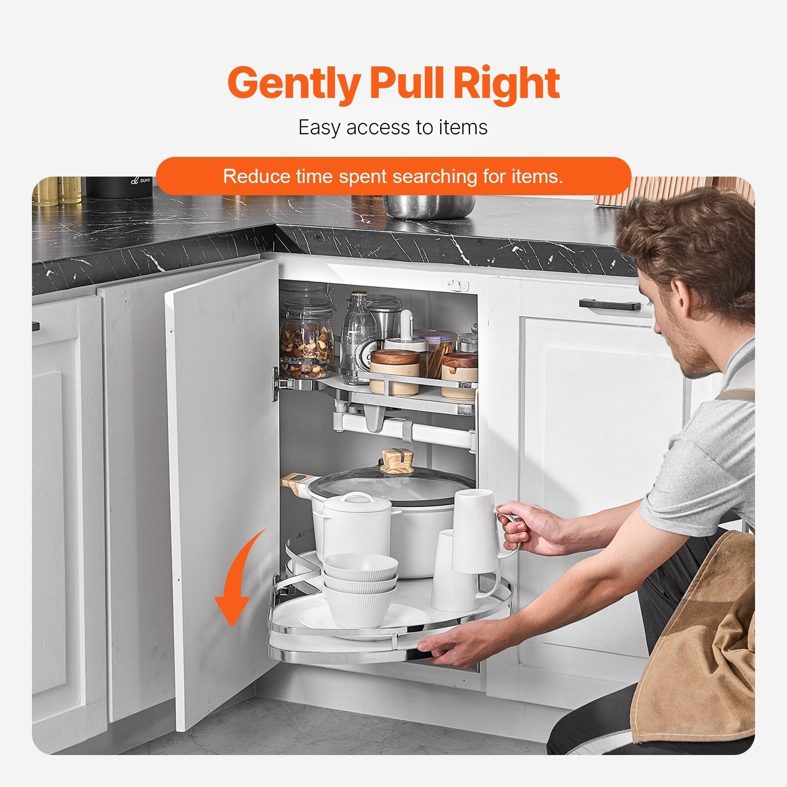 Cabinet Blind Spot Storage: The kitchen blind cabinet organizer features a clever design that addresses kitchen corner blind spots, transforming hard-to-reach deep spaces into efficient storage areas and preventing wasted space. When your cabinet door opens to the left, choose the right rotation pull-out turntable.
