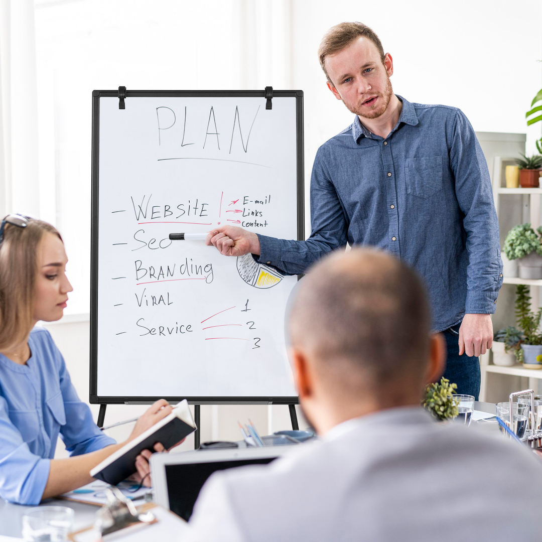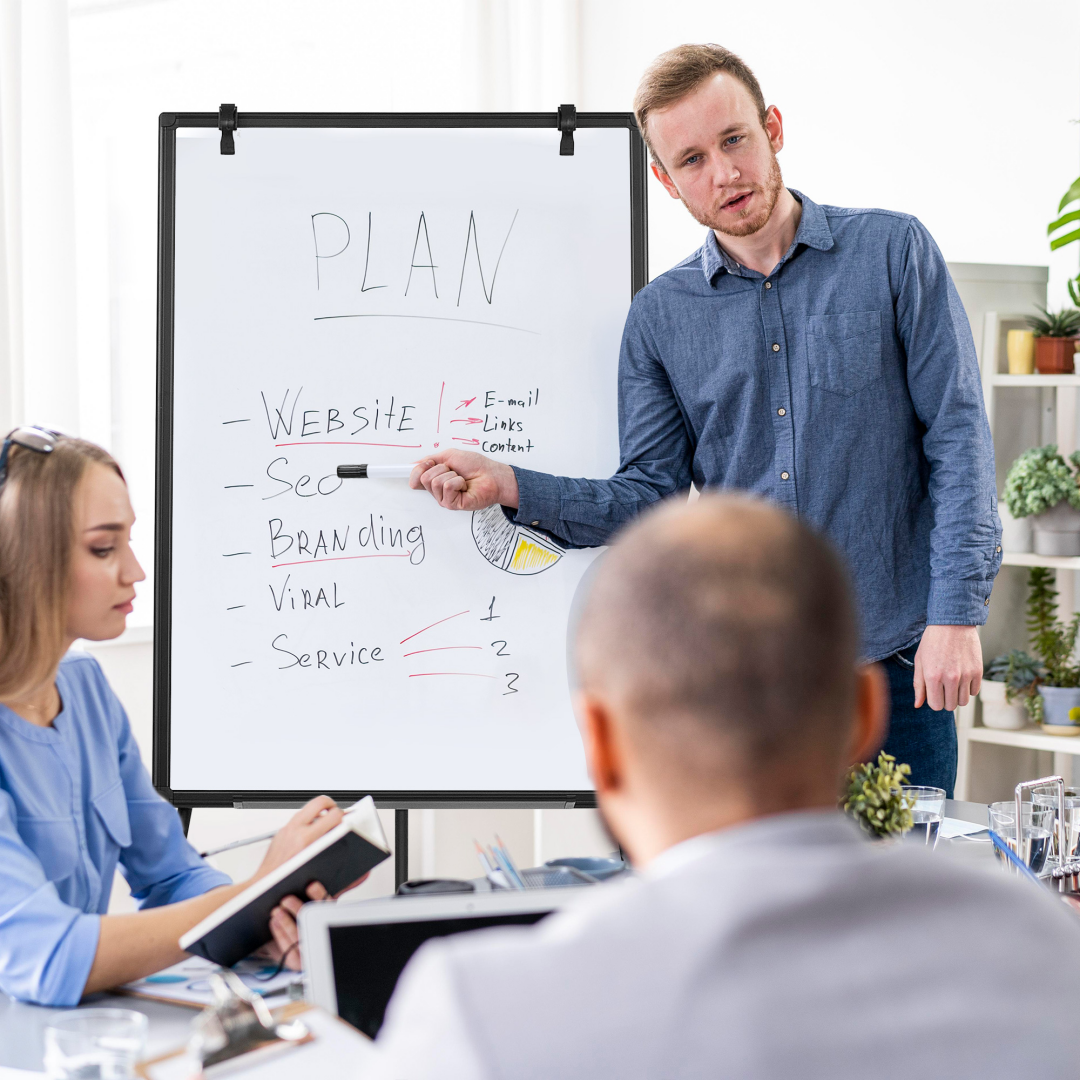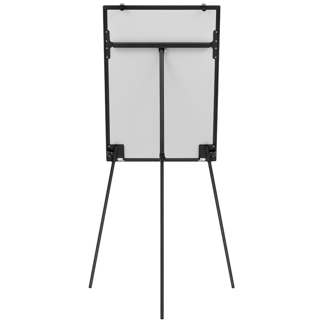 The easel whiteboard features a stable steel tripod stand with rubberized feet, ensuring secure positioning during writing or erasing activities. The lightweight and collapsible design allows for easy portability and flexible placement across various settings, enhancing practicality and convenience.