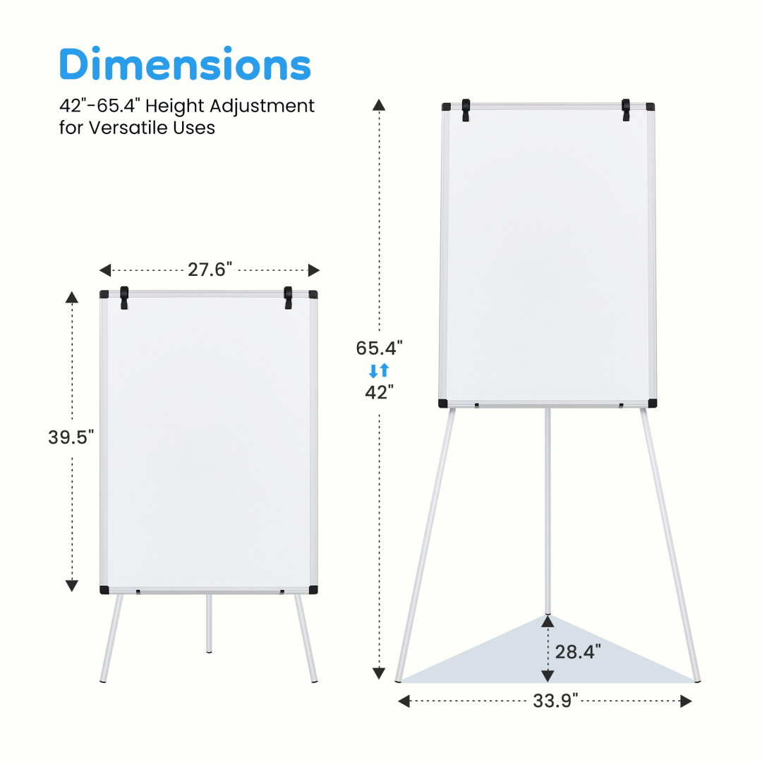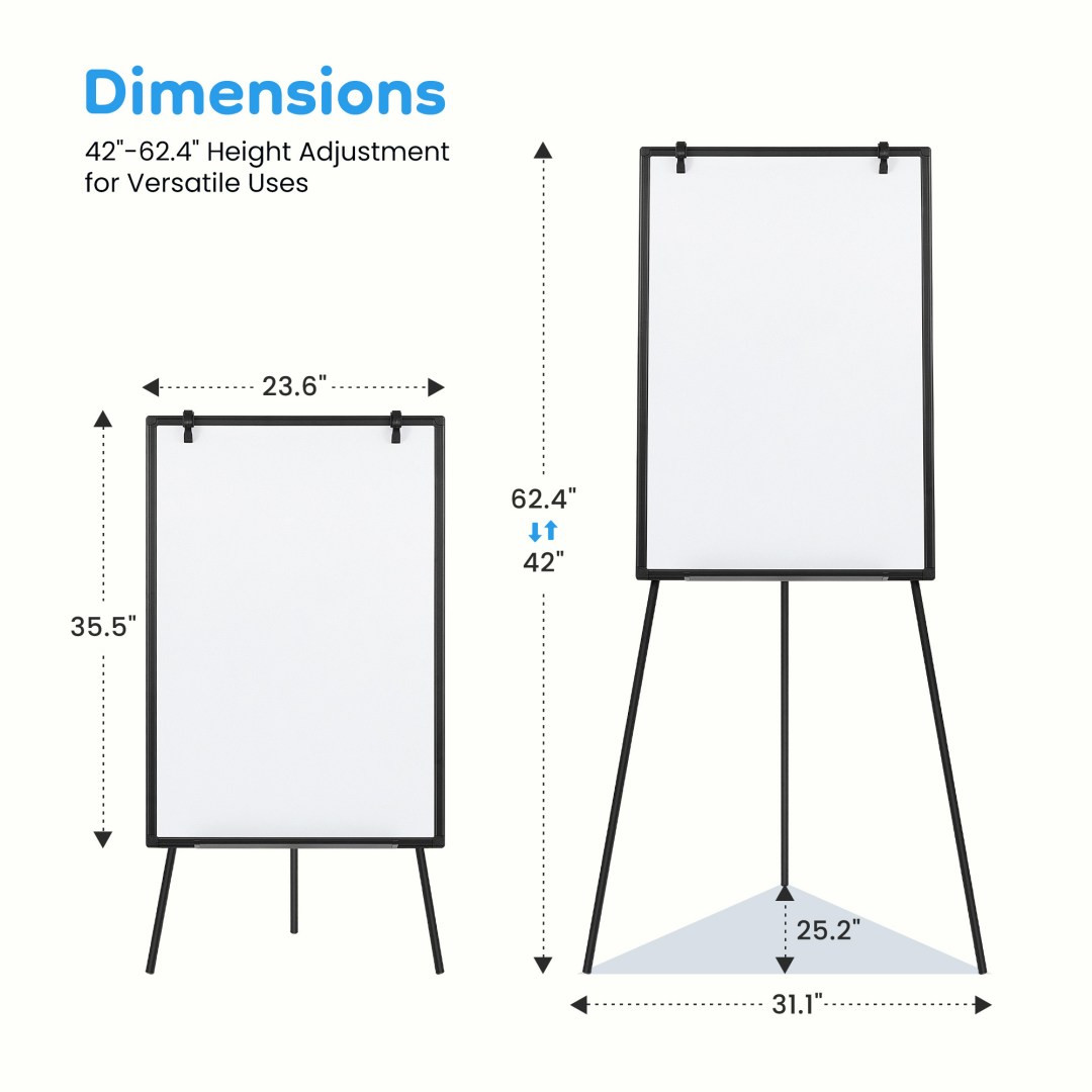 The height of the easel is fully adjustable from 42 to 63 inches, with calibrated markings on the tripod legs to enable precise and effortless height adjustment and leveling. This adaptability ensures an ergonomic viewing and writing position for users of all ages, whether seated or standing.