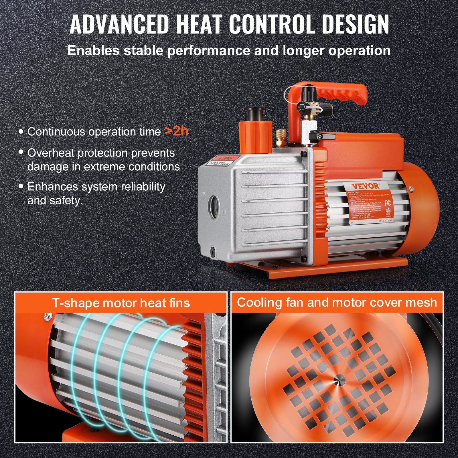 Take on the Heat: Say goodbye to constant downtime with our innovative 2-stage vacuum pump! The T-shaped heat sink and cooling fan help the pure copper motor to effectively dissipate heat, allowing it to work continuously for over 2 hours. And with added overheat protection, you can enjoy stabilized performance and longer service life for your motor.