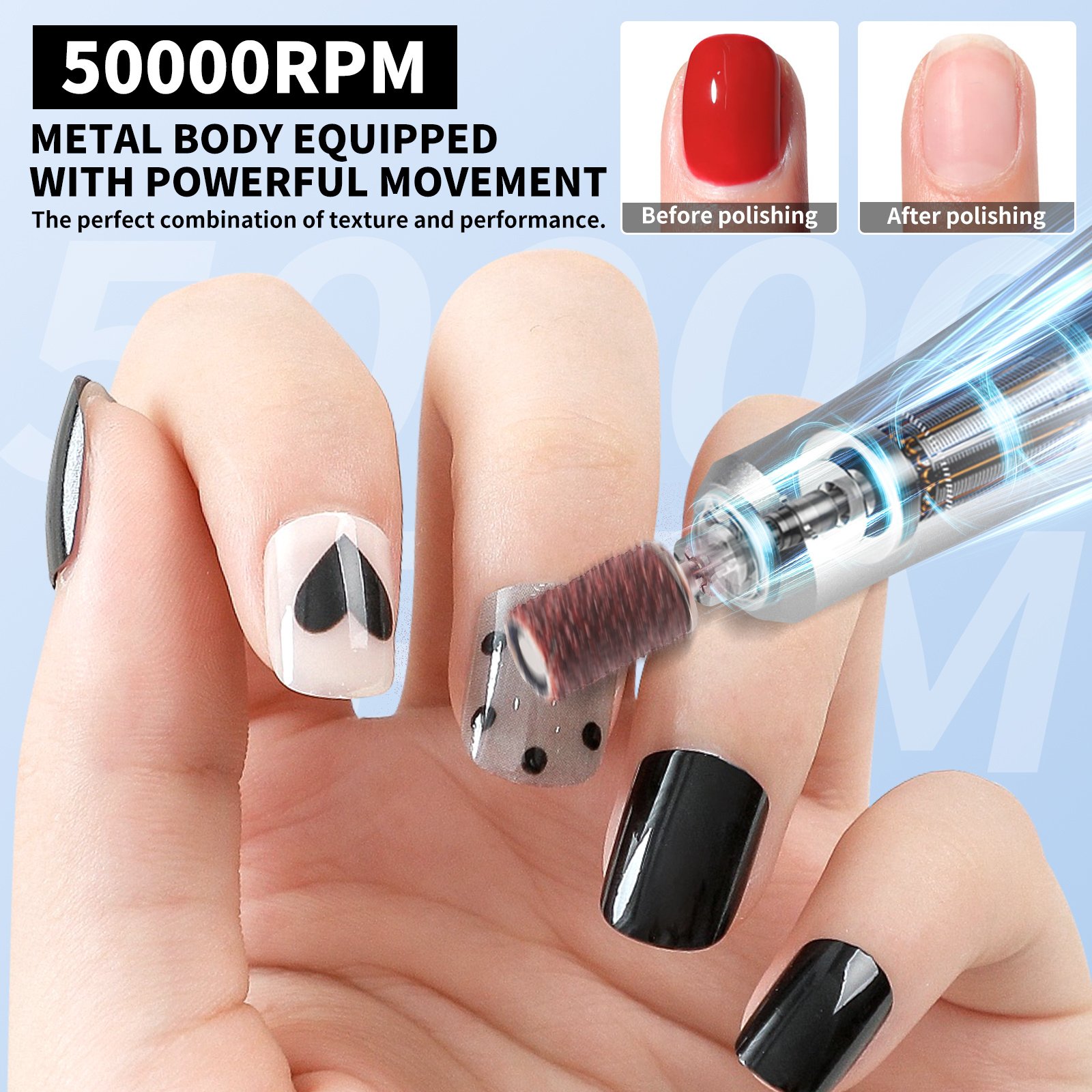 50000RPM HIGH POWER & BRUSHLESS MOTOR: Professional-grade torque effortlessly removes gel/dip/acrylics in seconds. Zero vibration design prevents hand fatigue during long sessions – perfect for salons!