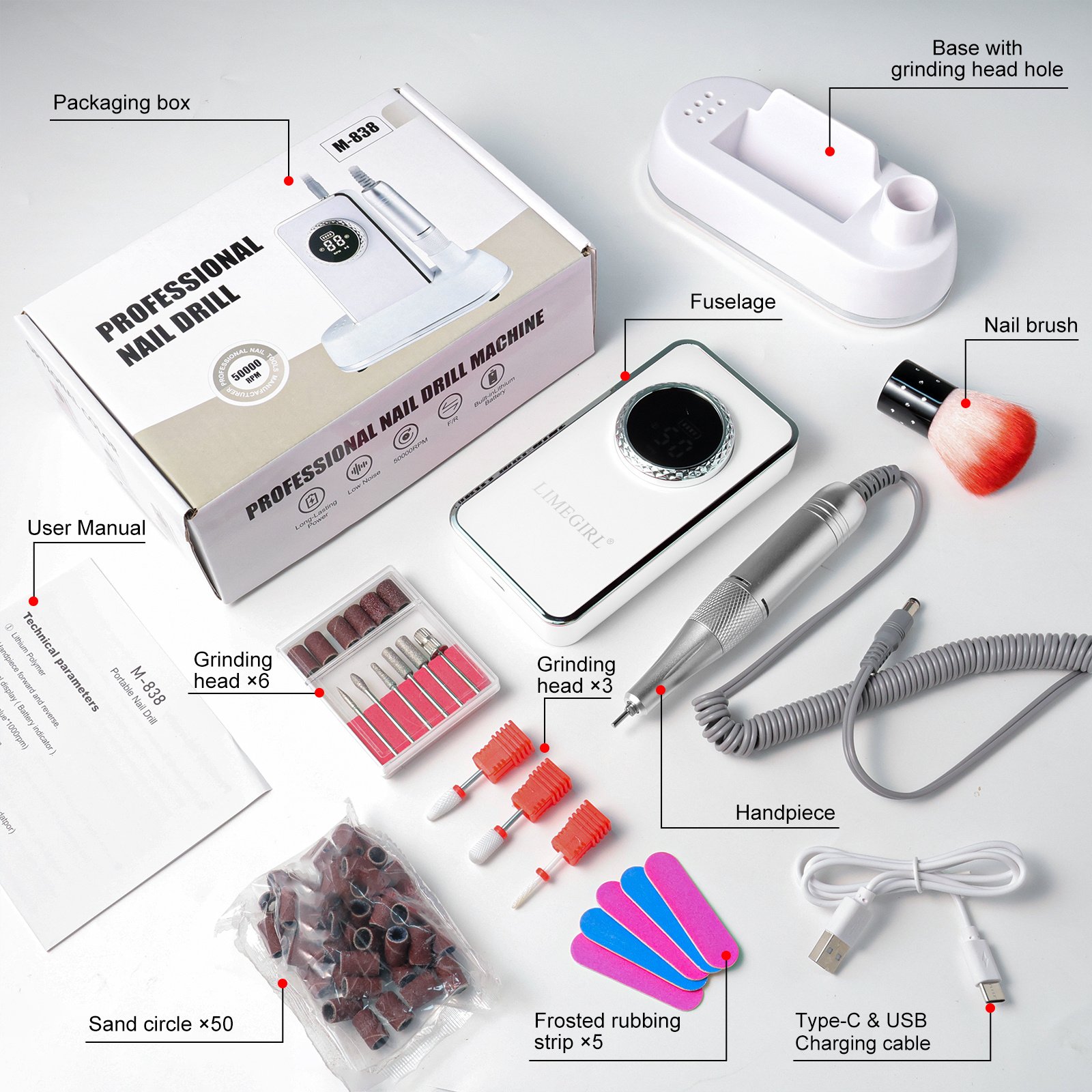 Complete Nail Drill Bit Kit Included: Comes with 6 Nail drill bits 3 premium ceramic bit,5*Nail file, 50*Sanding bands and 1*brush are included. Universal beauty & personal care set, to create perfect nails anytime, anywhere, saving you time.