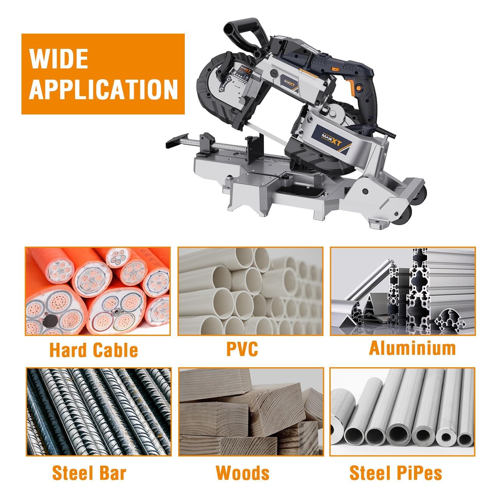 - It swiftly and efficiently saws through a wide range of materials including steel, aluminum, composite cable, angle iron, steel pipe, solid steel, aluminum profile, PVC pipe, and stainless steel