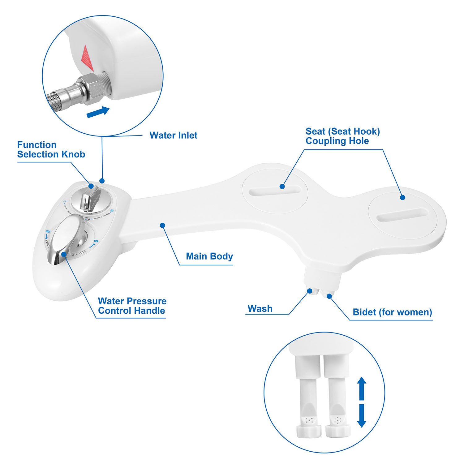 *Two Nozzle Cleaning Modes*:Includes bidet wash(for men and women) and female wash(women’s private),the spray of the female wash is gentler than the bidet wash,which offers refreshing hygienic wash and is healthier for pregnant women.