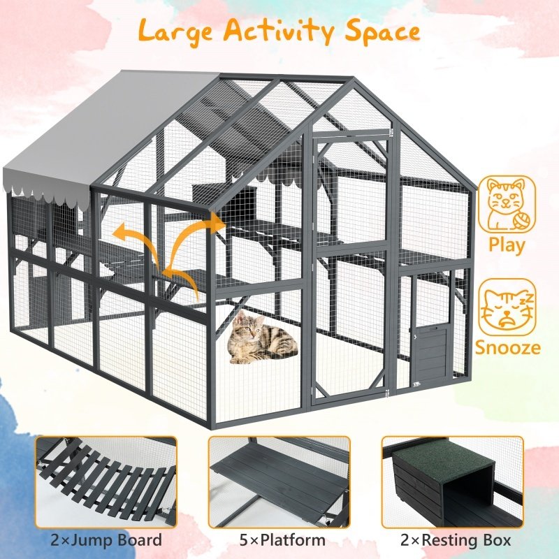 - 【Multi-Functional Fun Cat Playground】The Outdoor cat enclosure features diverse facilities, including 2 bridges, multiple platforms , and 2 rest houses. These designs offer cats abundant climbing, jumping, and resting spots, allowing them to enjoy outdoor fun to the fullest.