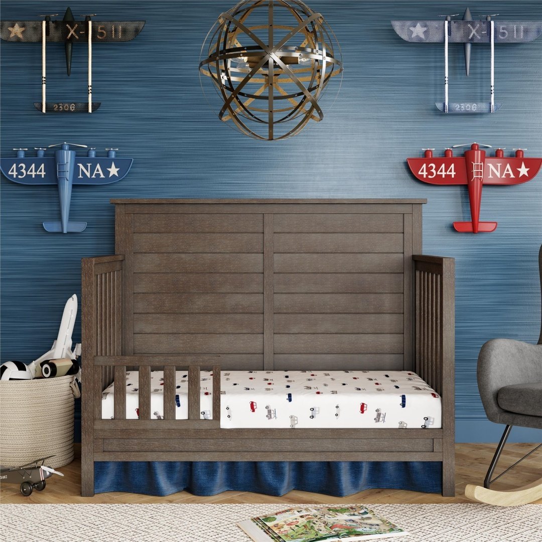 With its sturdy pine construction and vertical slats for easy monitoring of your little sprout, the Finch Toddler Bed Guard Rail will be your go to choice for converting your Convertible Crib (sold separately) into a comfy toddler bed both you and your big kid will love.