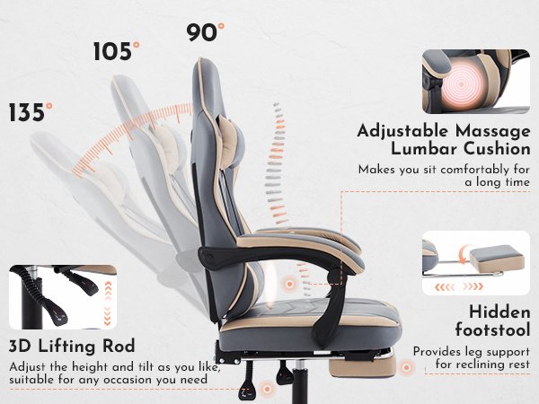 - Versatile And Adjustable: The gaming chair includes an adjustable headrest, a seat height adjustment range of up to 4 inches, and retractable foot supports to meet the needs of users of different heights. The back of the chair can be adjusted to 90°, 105°, and 135°, so you can find the ideal Angle for work, play, or relaxation. The chair also has silent wheels to make the movement smoother and quieter for the best comfort experience