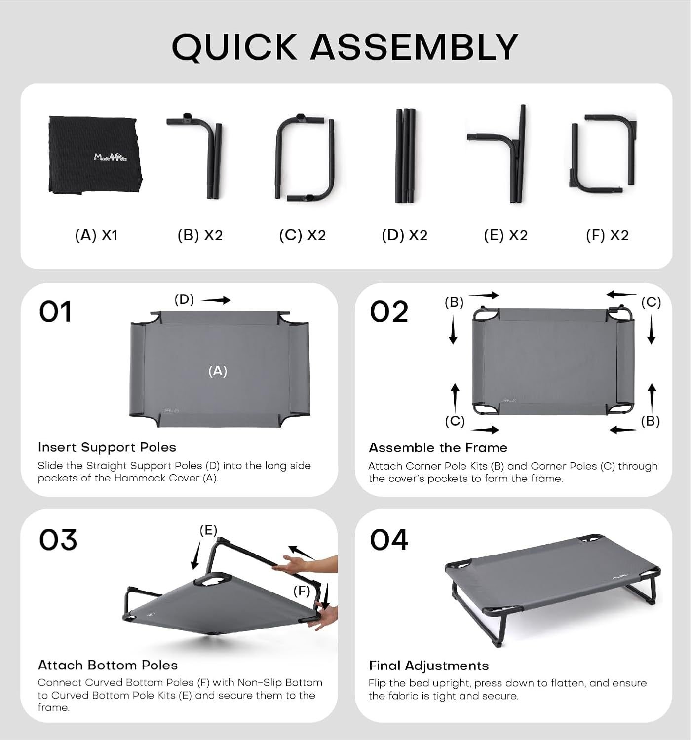 • Tool-Free, Hassle-Free Setup – No screws or tools needed-just slide and click.The plug-in design allows for fast, frustration-free assembly.Whether you’re at home or packing for a trip, this easy-to-assemble elevated dog bed sets up in minutes