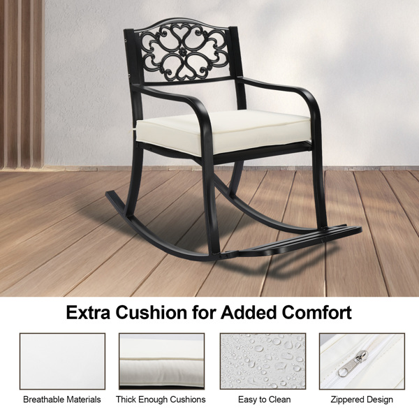 1.Extra Cushion – Designed to improving the comfortable experience, the metal rocking chair add the cushion to providing better seat feelings and the cushion can be removed when you don’t need it. You can enjoy the comfort and the relaxcation the chair brings to you