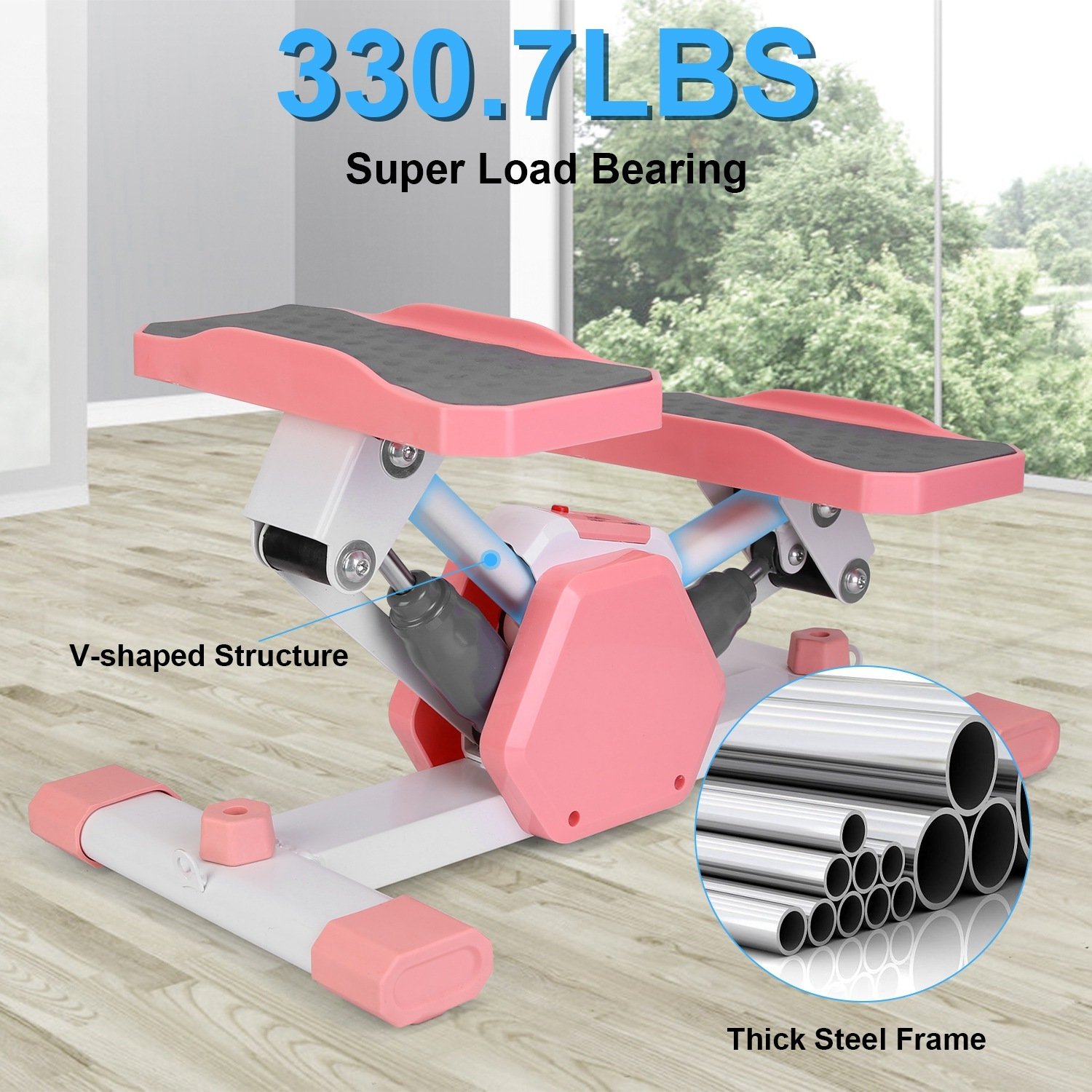 • *Dual Hydraulic Drive System*: Built with thick steel and advanced hydraulic system,our stepper machine is sturdy enough to hold up to 330.7lbs. The V-shaped stepping structure provides a 38° movement angle,minimizing the strain on their knees and ankles.