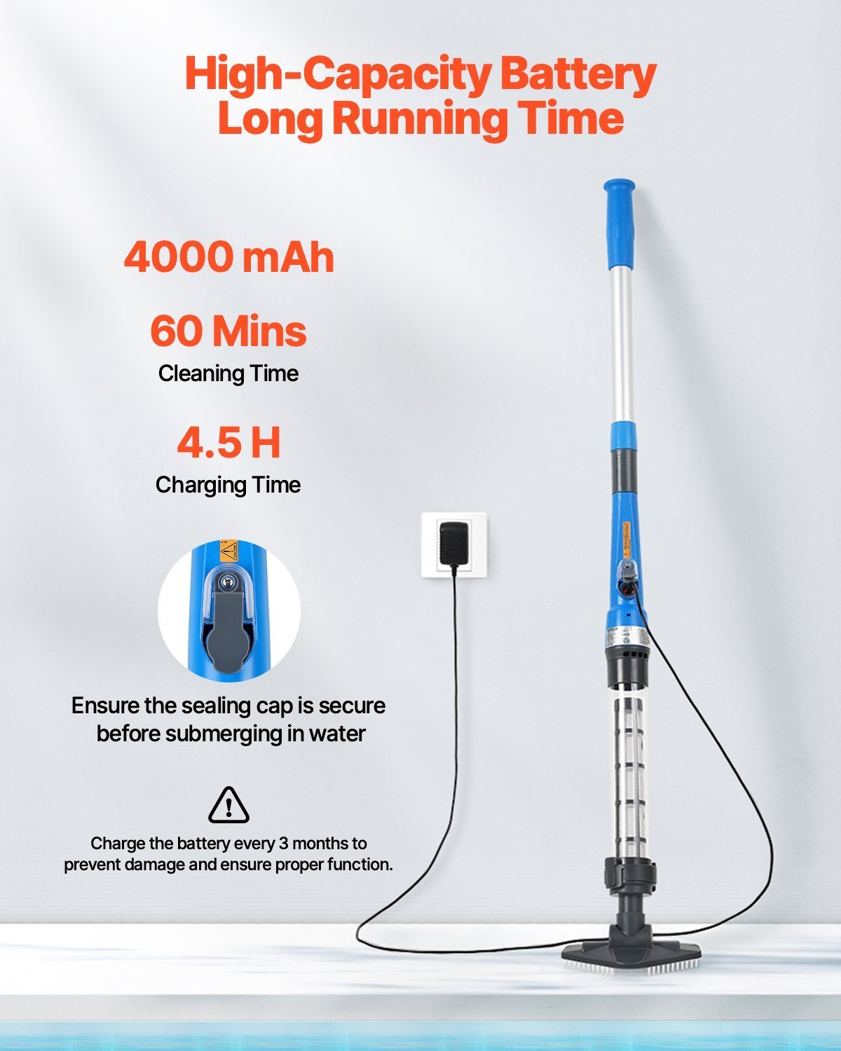 Rechargeable & Cordless Use: With a built-in 4000mAh battery, this rechargeable pool cleaner allows you to clean any area of your pool freely without being restricted by power cords. It provides up to 60 minutes of runtime on a full charge, ensuring uninterrupted cleaning without frequent recharging. Note: Please fully charge before first use.