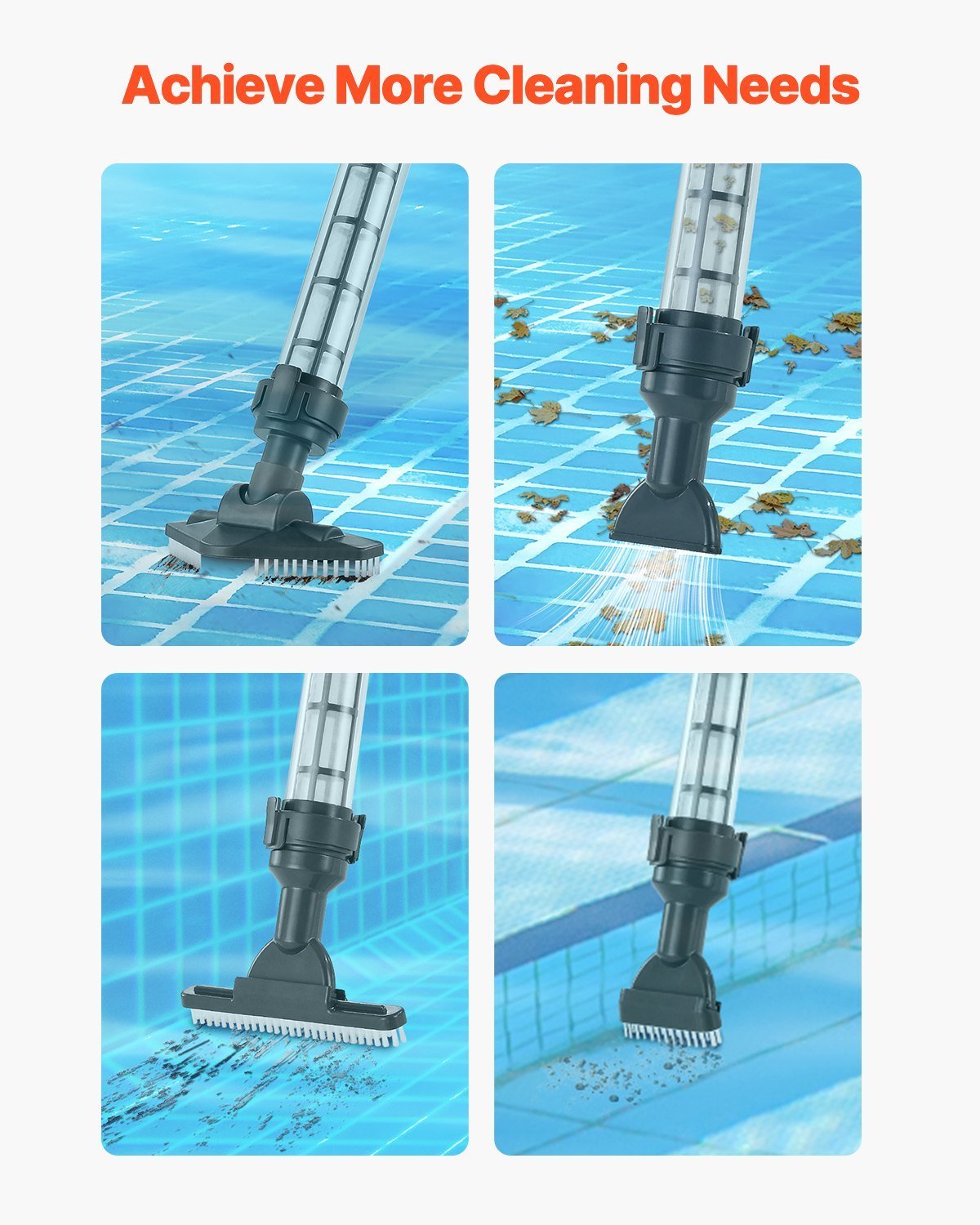 Versatile Cleaning: This handheld pool vacuum comes with four brush heads—triangle brush, long brush, short brush, and suction nozzle. Simply attach the appropriate brush head to tackle pool stairs, corners, and other hard-to-reach areas with ease, achieving exceptional cleaning results.