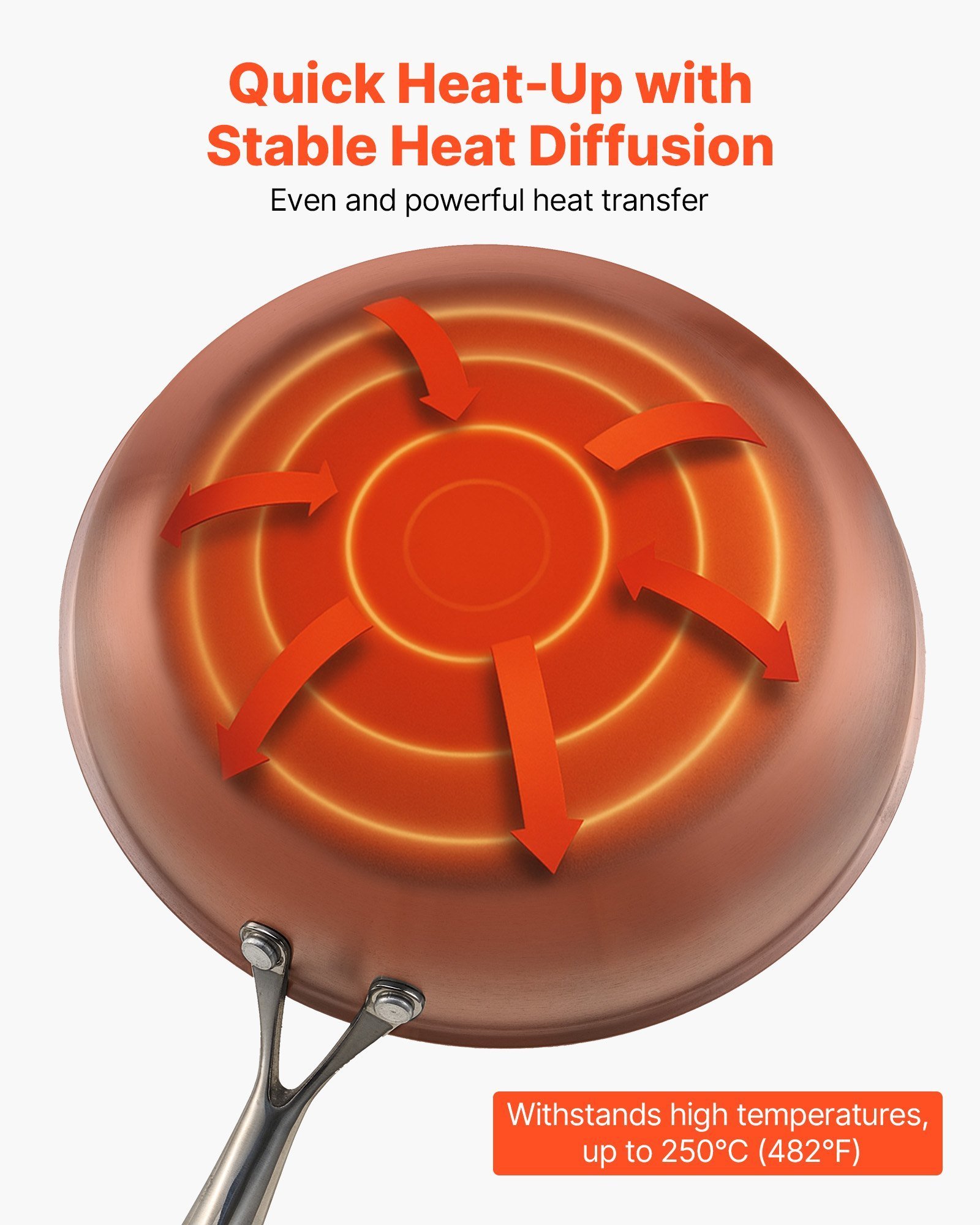 Built to Last: Our frying pan set features a triply-layer stainless steel with polished surface interior and exterior, providing even heat distribution and durability. Its composite stainless steel surface resists scratches and warping for daily use