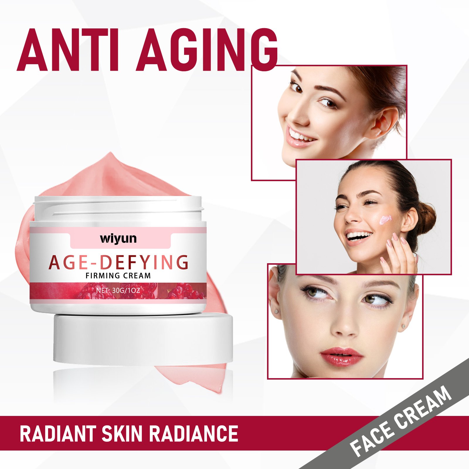 Our Age Defying Firming Cream contains niacinamide, hyaluronic acid and coffee extract. It enhances skin firmness and elasticity, makes your skin look younger, significantly reduces sagging and fine lines, and improves overall skin structure and appearance. Its use method is very simple: clean the facial skin, keep dry, apply appropriate amount of this product evenly on the face, gently massage from inside to outside until thoroughly absorbed. It can enhance skin firmness and fullness, and effectively combat skin sagging. The ingredients are mild and suitable for all skin types.