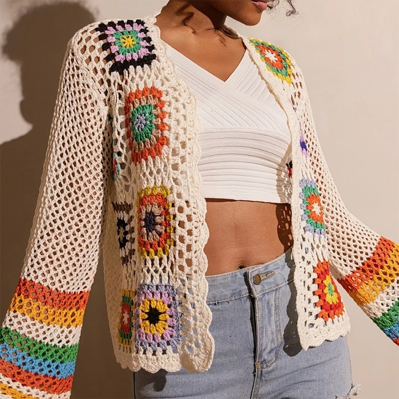 Elevate your spring and summer wardrobe with this beautifully crafted crochet cardigan. Featuring an elegant open-front design with vibrant color blocking, this lightweight cover-up adds instant boho charm to any outfit while providing just the right amount of coverage.