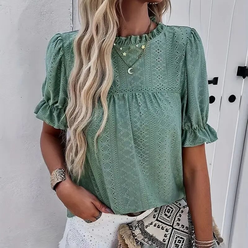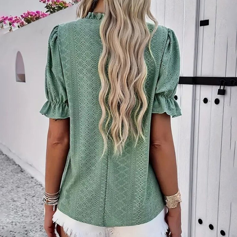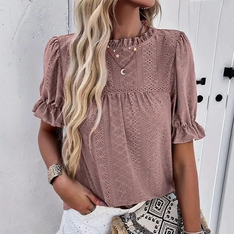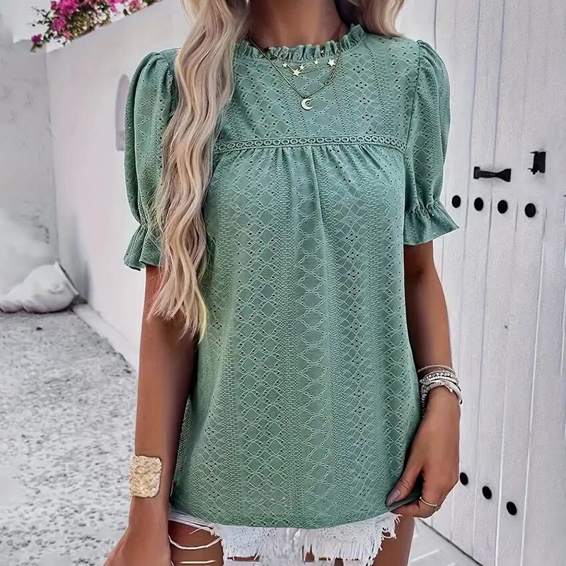 Women’s Elegant Ruffle Detail Blouse Short Sleeve Round Neck Top