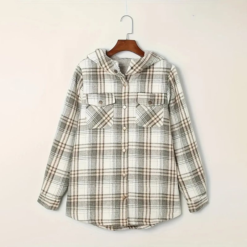 Stay cozy and stylish in our Plaid Hooded Fleece-Lined Jacket! .