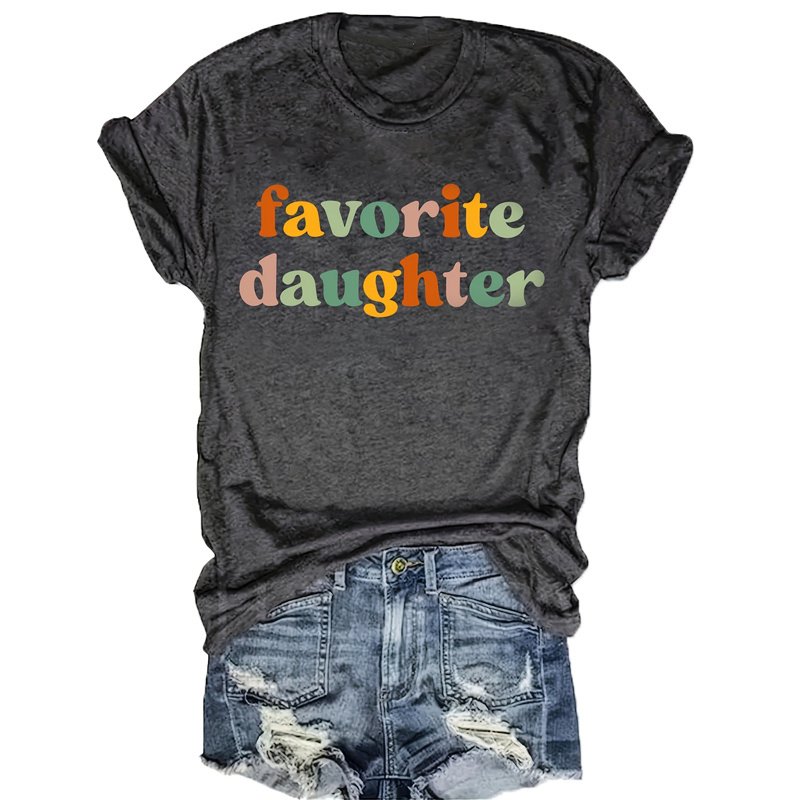 Women’s Round Neck Tee – Colorful Letter ‘Favorite Daughter’ Print Casual Summer T-Shirt
