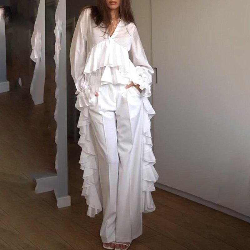 Step into the spotlight with our Women’s Solid Color Ruffle Blouse, where modern tailoring meets artistic flair. Designed for the fashion-forward woman, this long-sleeve blouse features a flattering V-neckline, a dramatic high-low hem, and asymmetrical ruffles that create movement and dimension.