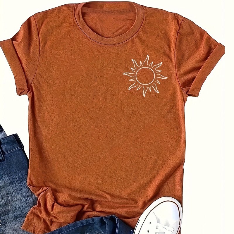 Women’s Sun Print Crew Neck T-Shirt, Casual Short Sleeve Top For Spring & Summer