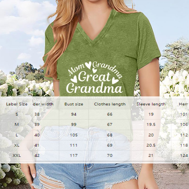 Celebrate your family legacy with this sentimental “Mom Grandma Great-Grandma” T-Shirt ! Featuring a heartfelt generational letter print , this V-neck summer top is the perfect way to honor the special women in your life.