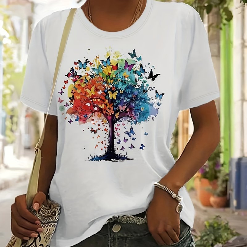 Women’s Vibrant Butterfly & Tree Graphic T-Shirt – Breathable Round Neck Short Sleeve Tee, Soft Stretch Casual Summer Top