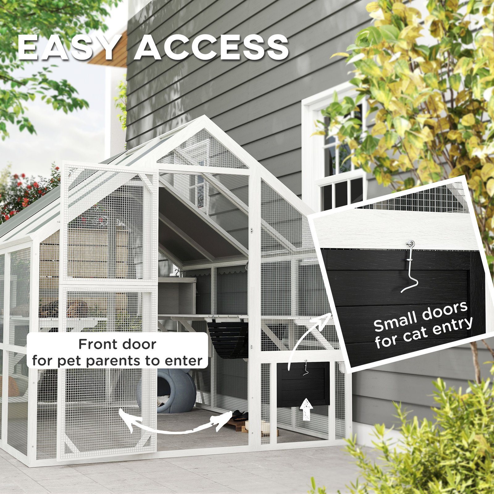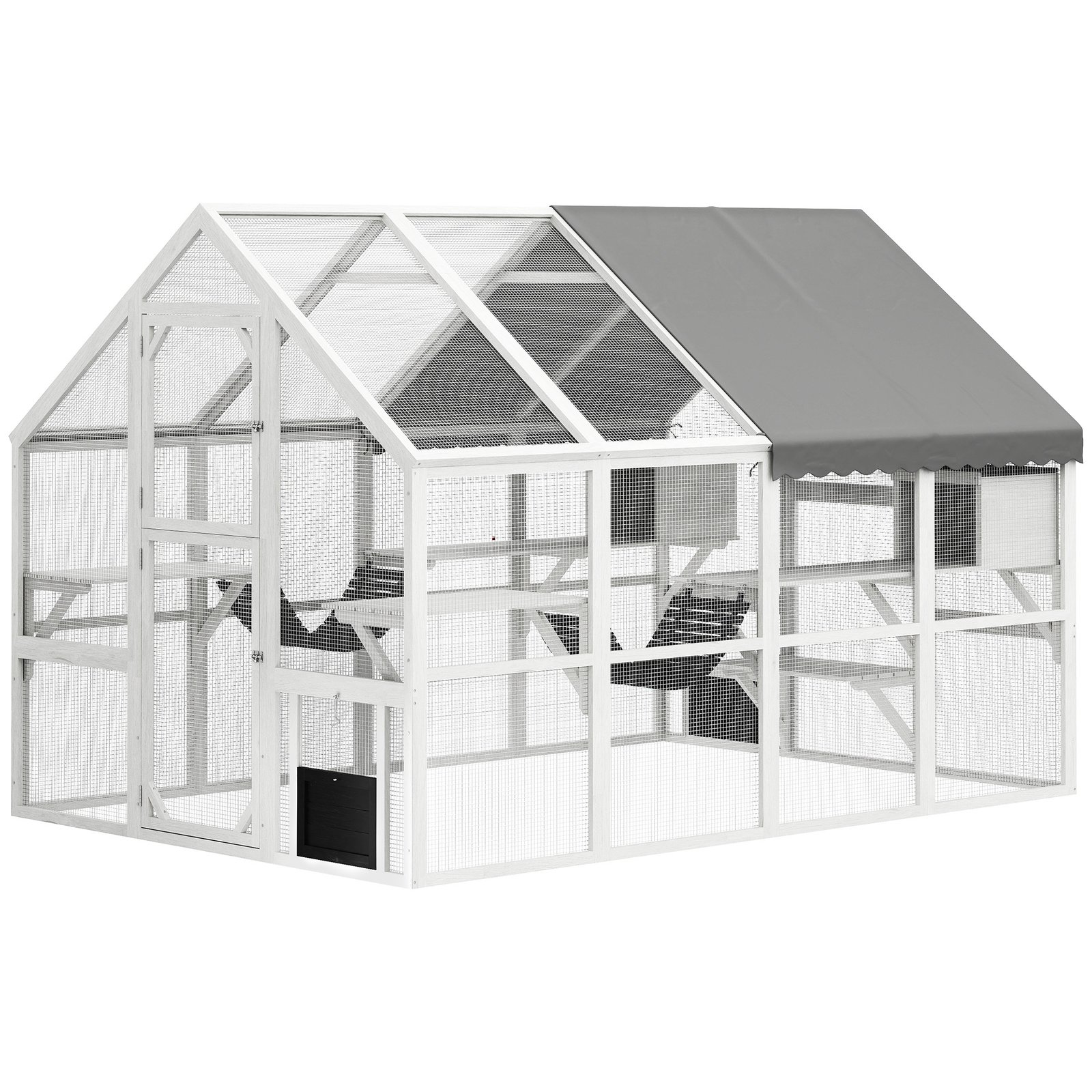 Wooden Catio Outdoor Cat Enclosure With Waterproof Cover, 2 Condos, 6 Platforms, Bridge, Doors, White