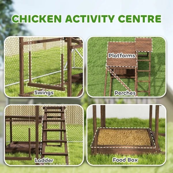 - – Comfortable Resting Spot: With chicken perch and platforms, your chickens can rest while enjoying a panoramic view of their surroundings. The food box below provides a spot for chickens to replenish their energy.